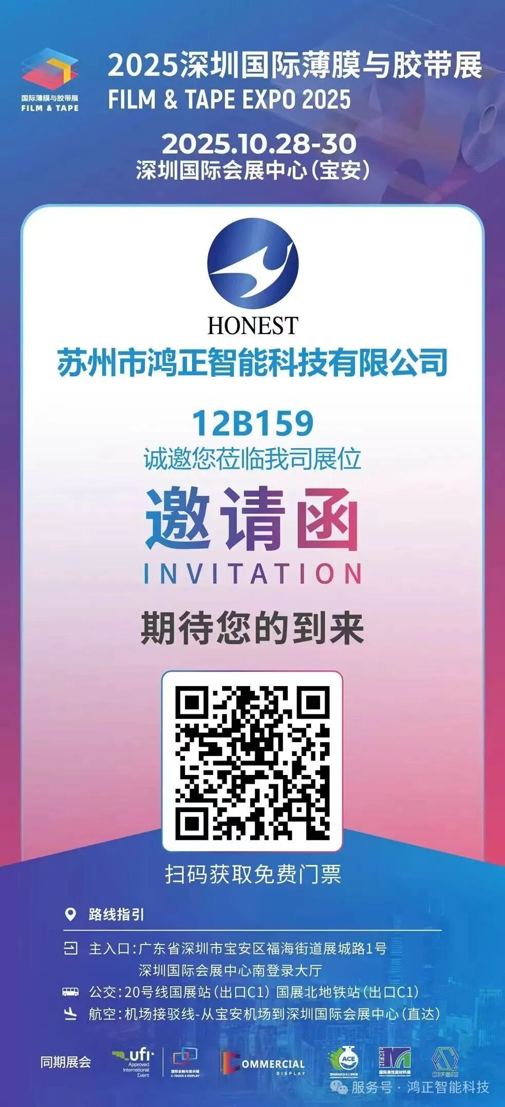 2025年10月19日——业内瞩目的2025深圳国际薄膜与胶带展(FILM & TAPE EXPO 2025)将于10月28日至30日在深圳国际会展中心(宝安)举行。苏州市鸿正智能科技有限公司(以下简称“鸿正智能”)将应邀参展,展位号为12B159,届时将展示公司在智能涂布、精密模切与自动化领域的技术成果,与业界伙伴共探发展新机遇。